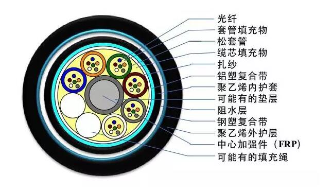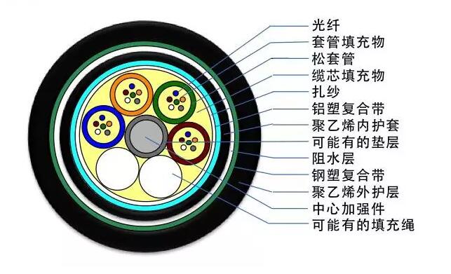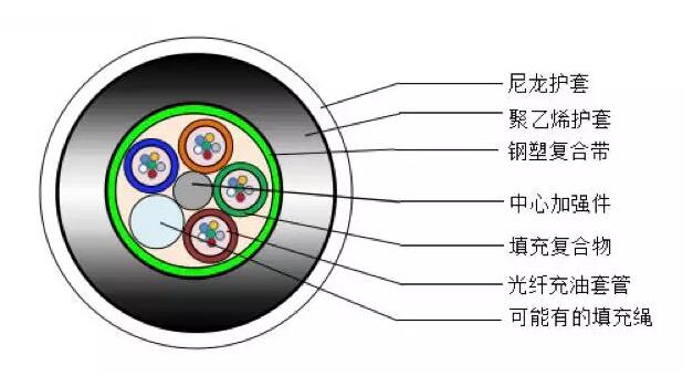 室外用、油膏填充、鋼帶縱包、聚乙烯內(nèi)護(hù)套、非金屬加強(qiáng)件、鋁-聚乙烯外護(hù)套