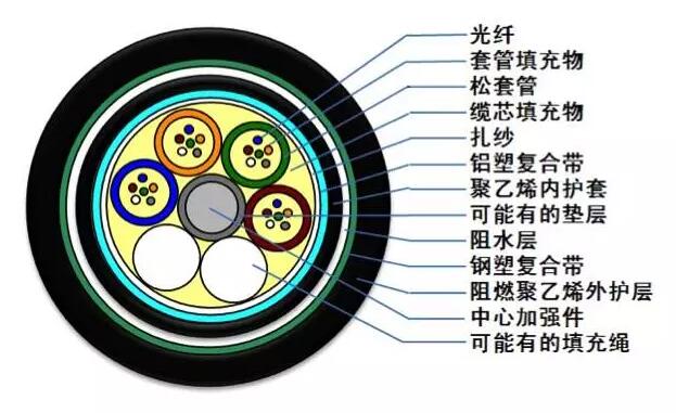 "室外用、油膏填充、鋁-聚乙烯內(nèi)護(hù)套鋼-聚乙烯內(nèi)護(hù)套、細(xì)圓鋼絲鎧裝、聚乙烯外護(hù)套"