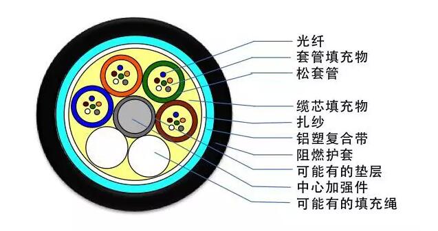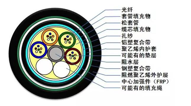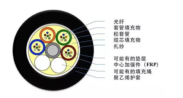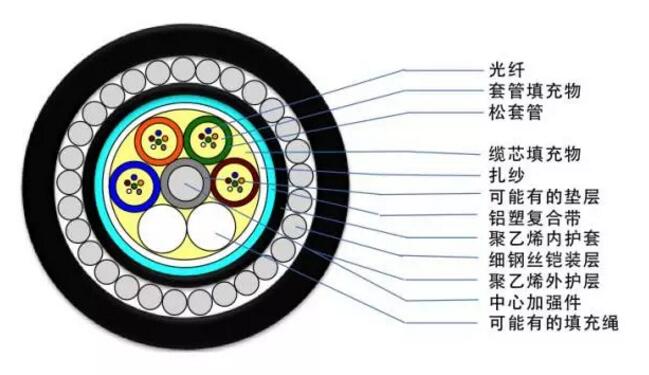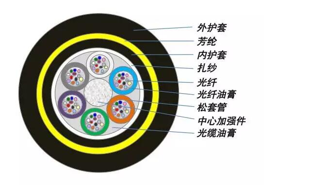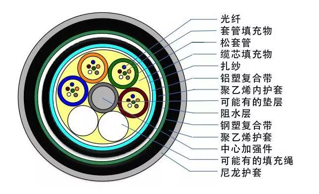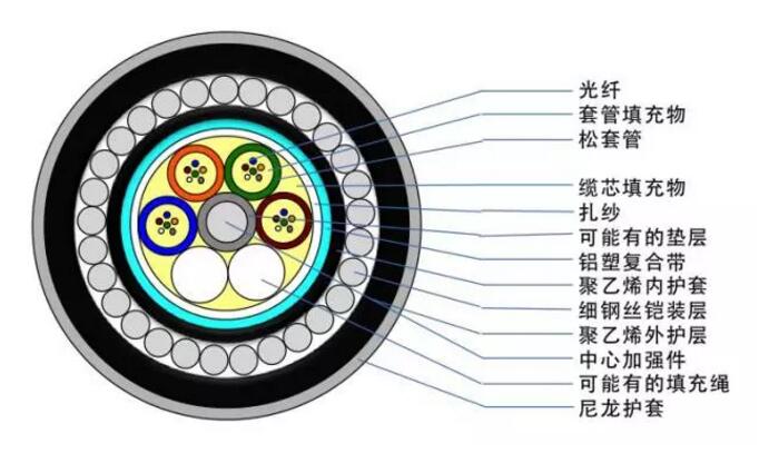 "非金屬加強(qiáng)件、松套層絞、聚乙烯內(nèi)護(hù)套芳綸鎧裝、聚乙烯外護(hù)套"