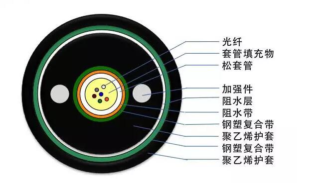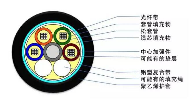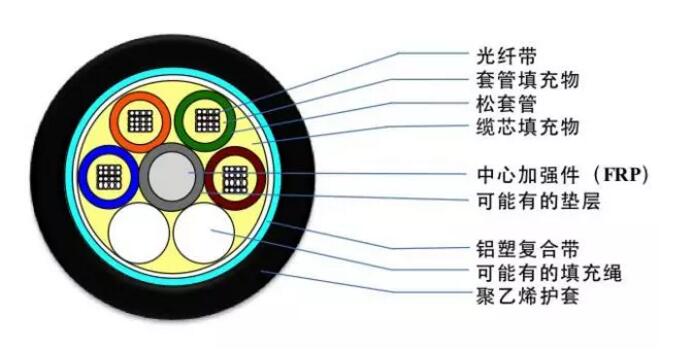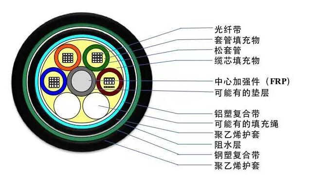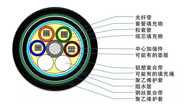 "室外用、非金屬加強(qiáng)件、光纖帶、油膏填充鋁-聚乙烯內(nèi)護(hù)套、鋼-聚乙烯外護(hù)套"