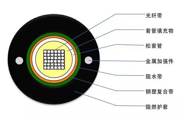 "室外用、光纖帶、中心管式、油膏填充夾帶鋼絲的鋼帶-阻燃聚乙烯護(hù)套"