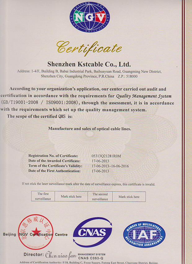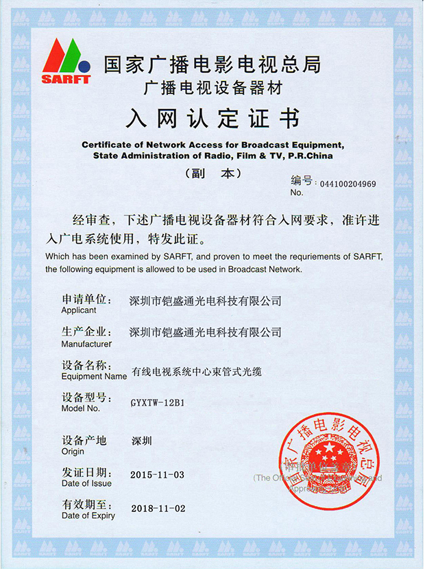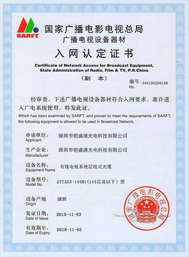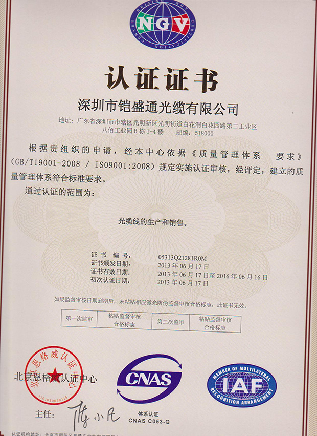 鎧盛通光纜集團(tuán)是一家獨(dú)資企業(yè),本公司通過了ISO9001國際質(zhì)量體系認(rèn)證,美國(UL)認(rèn)證及加拿大(CUL)認(rèn)證,并獲得了國家信息產(chǎn)業(yè)部入網(wǎng)許可證(現(xiàn)為泰爾認(rèn)證),產(chǎn)品均按中國國家標(biāo)準(zhǔn),美國及歐洲行先進(jìn)生產(chǎn)標(biāo)準(zhǔn)生產(chǎn),品質(zhì)保證25年,敬請(qǐng)放心使用!